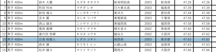 高校3年時(城西大学附属城西高校)、インターハイ東京都大会の速報として「男子400m、日高裕喜人選手(城西3)が47秒63で優勝!」と報道されています。