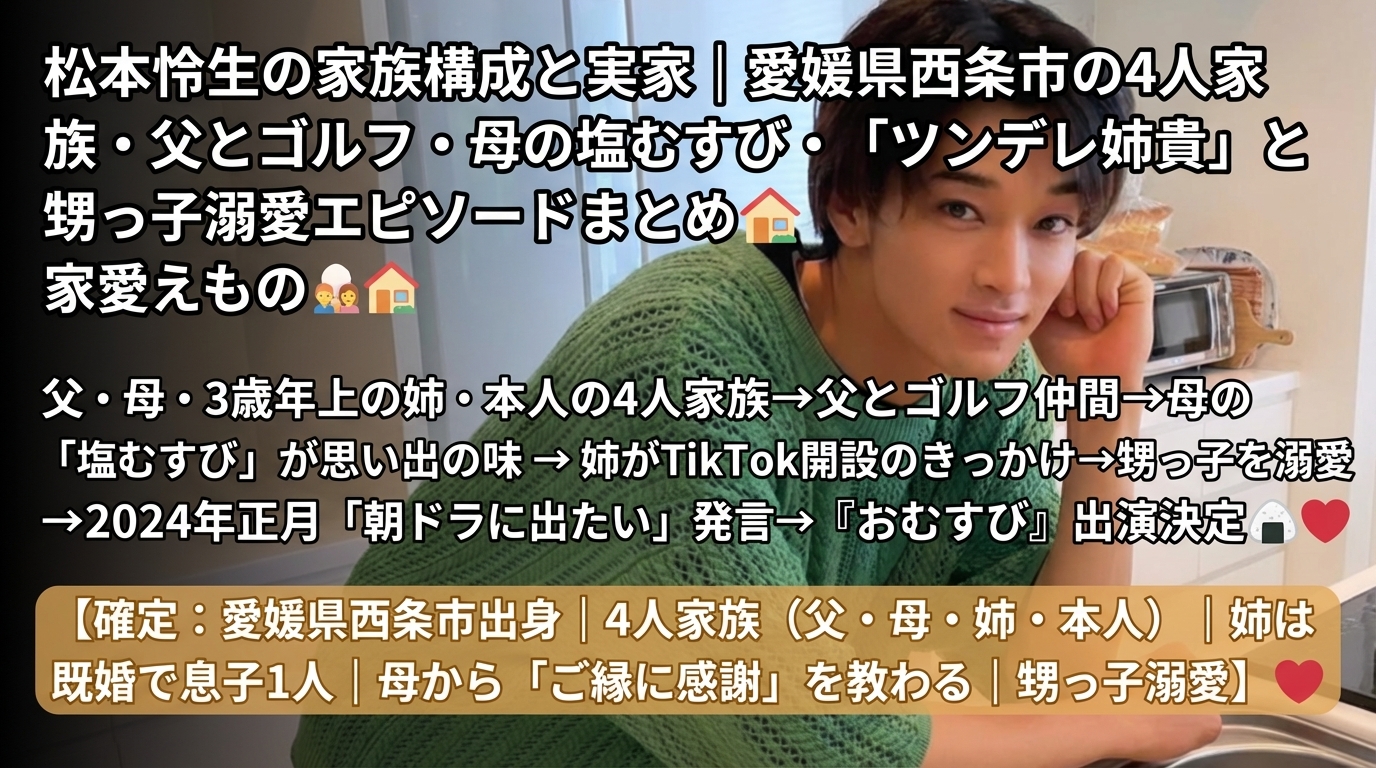結論から言うと、松本怜生さんの実家は愛媛県西条市にあり、父・母・3歳年上の姉・本人の4人家族です。姉は結婚して息子(松本さんの甥っ子)が1人おり、松本さんは甥っ子を溺愛。2024年正月に家族と「朝ドラに出たい」と話した直後に『おむすび』出演が決まるという運命的な展開もありました。