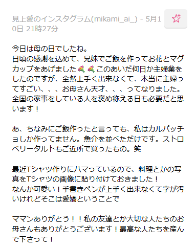• 見上愛 Instagram(@mikami_ai_)母の日の投稿